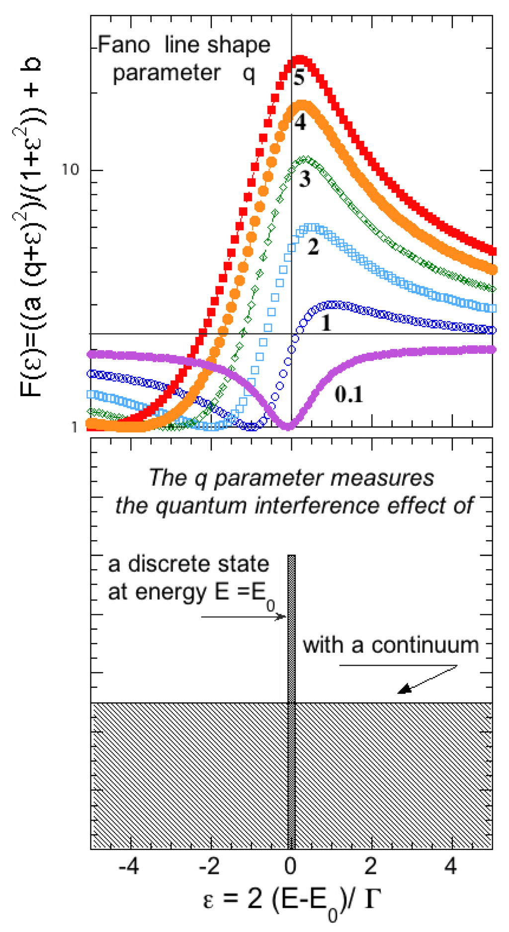 Using a phenomenological parameter q and a reduced energy ɛ defined by 2(E – E0)/Γ where E0 is the resonant energy and Γ is the width of the autoionized state, this equation predicts a maximum and a minimum in the Fano line-shape. The Fano formula is a superposition of the Lorentzian line shape of the discrete level