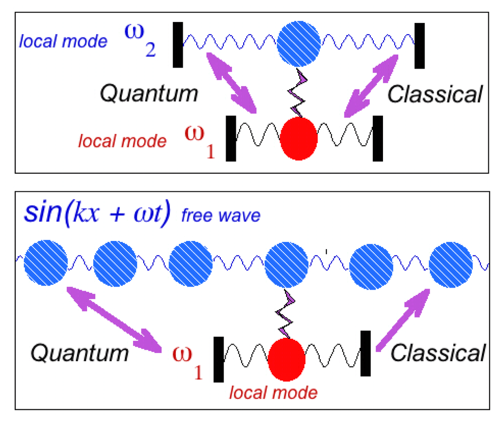 There is not such a resonance in classical physics between the localized mode and the free wave. The lower panel of Figure 7 shows a chain of oscillators coupled to a local oscillator. If energy is injected into the local oscillator the energy flows into the chain of oscillators while the local oscillator goes back to the resting state. The energy given to chain of oscillators flows away as a wave, sin(kx + ωt) and it does not come back to the local oscillator.