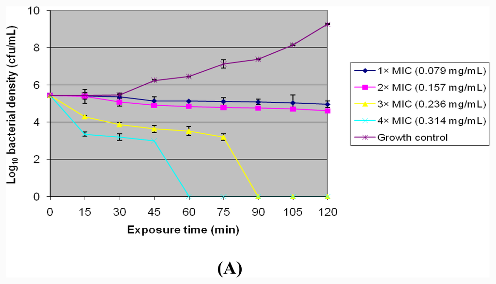Sudjana et al.’s method [56] was used to determine the minimum bactericidal concentration (MBC) from the MIC broth microdilution assays by subculturing 10 μL volumes from each well that did not exhibit growth after 24 h of incubation and spot inoculating it onto fresh Mueller-Hinton agar plates. The plates were incubated for 48 h after which the numbers of viable colonies were counted. The MBC was defined as the lowest concentration killing more than or equal to 99.9% of the inoculum compared with initial viable counts [56].
