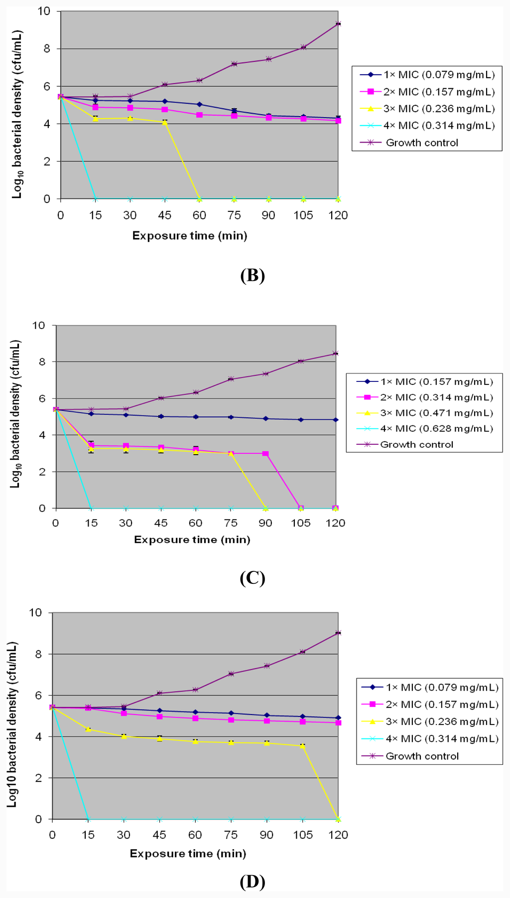 Rate of kill assays show the bactericidal activity or the duration of a bacteriostatic effect of a fixed concentration of the antimicrobial agent, thereby providing a clear analysis of the relationship between the extent of microbial population mortality and the antimicrobial agent concentration [46,47].The rate of kill activity of the n-hexane extract proved to be bactericidal at ×2 (for L. ivanovii (LEL 30) only), ×3 and ×4 MIC values after 2 h exposure time for all the test organisms, since a reduction of the viable bacterial density of ≥99.9% or ≥3log10 in cfu/mL is used as a standard of measurement for bactericidal efficacy [48,49]. The acetone extracts [33], methanol extracts [29], butanol and diethyl-ether fractions of the methanol extract [50] of Garcinia kola seeds were also found to exhibit bactericidal activities against both Gram positive and Gram negative bacteria, with the findings of Akinpelu et al.[50] and Sibanda and Okoh [33] showing a concentration- and time-dependent killing activity similar to this study.