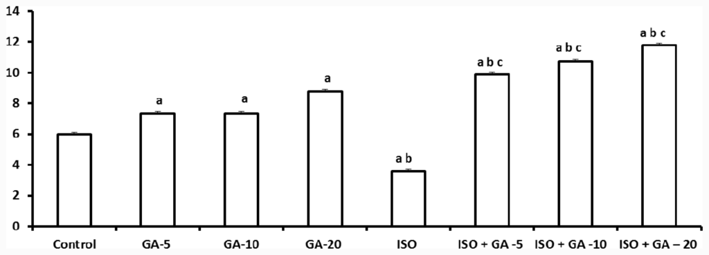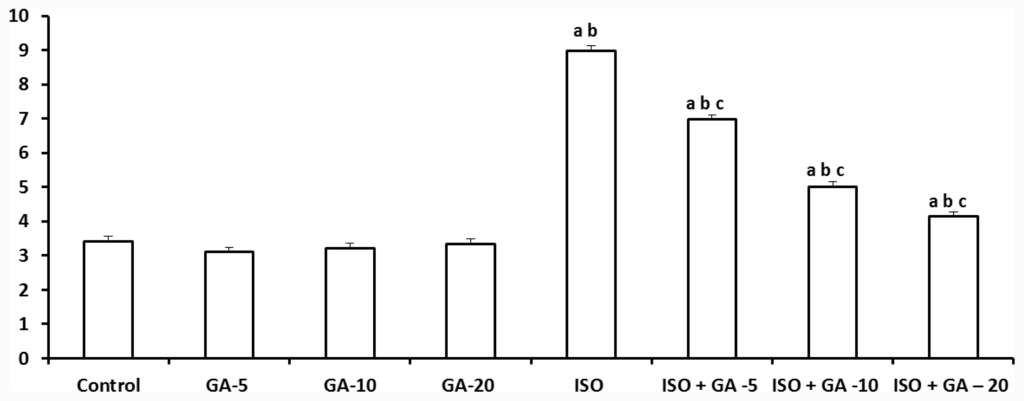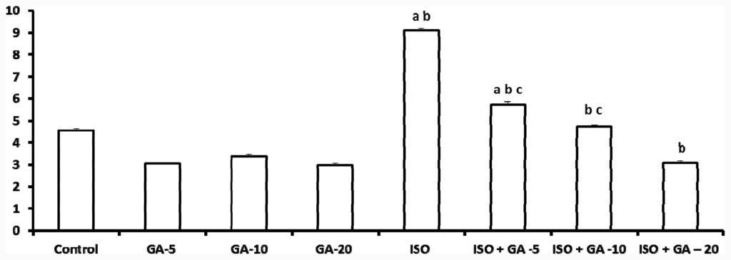 When compared with the pair-wise technique, the ISO-control group showed a significant increase (p < 0.05) in cardiac LPO levels compared to the control group. GA alone treated groups at all three doses did not show any significant change in LPO level. GA treatment to ISO groups resulted in significant decrease (p < 0.05) in LPO level, compared to the ISO-control group. GA at all three doses decreased LPO levels significantly, but the level was significantly higher (p < 0.05) than control rats (Figure 1).