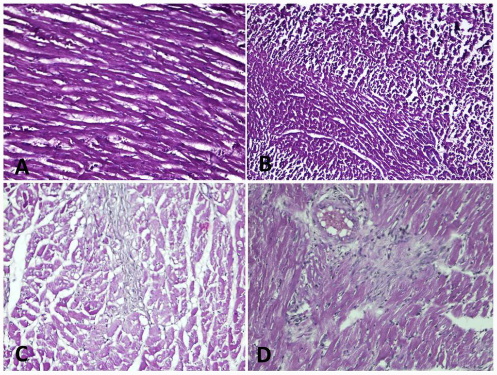 Histopathological analysis of rat myocardium: (A) Normal appearance myocardial tissue in control rats. (B) Normal myocardium without any necrosis or nuclear pyknosis in GA alone group. (C) Myocardial infarction with ISO treatment showing necrosis and scar formation. (D) Vascular proliferation and macrophage activity in ISO + GA treated group (200×).