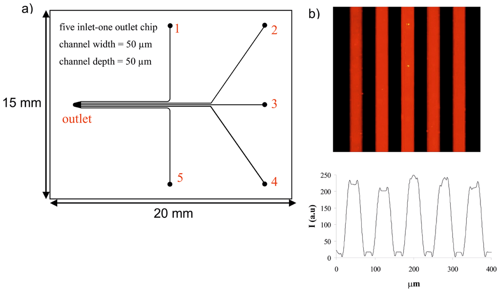 (a) Design of the five inlet-one outlet multichannel chip surface; (b) A fluorescence microscopy image and concomitant intensity profile of the red luminescent multichannel device.