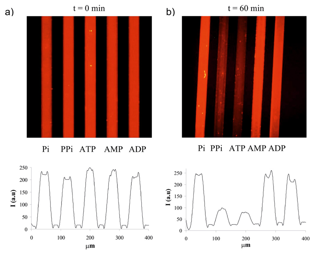 The different sensing properties of the anions on the microchannel surface are presumably due to the different binding affinity of the anions to Eu3+, which is correlated with number of phosphate oxygens that coordinate to Eu3+ after the displacement of the antenna [54]. As seen in Figure 3, Pi, AMP and ADP showed no response (similar to only buffer, data not shown). In contrast, PPPi displaced 2 almost as effective as ATP indicating the importance of the number of phosphate oxygens on the strong coordination with Eu3+ [55,56] resulting in displacement of 2 from 2-1.Eu3+. PPi as a diphosphate also caused a fairly strong response of the 2-1.Eu3+ complex owing to its high binding affinity to Eu3+ [54]. On the other hand, among the diphosphates PPi, ADP, and NADP different responses were seen, especially the sensing of PPi was much stronger than the other diphosphates indicating that the side groups of ADP and NADP might decrease the binding affinity of the phosphate groups to Eu3+, thus leading to less effective displacement of 2 from 2-1.Eu3+ compared to PPi. Thus, these results show that the phosphates possess different sensitivities to the 2-1.Eu3+ complex, especially ATP, PPi and PPPi exhibit stronger response to the Eu3+ based assembly compared to the other phosphates.