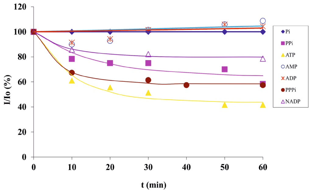 The luminescent multichannel platform was used for the detection of biologically relevant phosphate anions. Five different phosphates (1 mM each), ATP, adenosine monophosphate (AMP), adenosine diphosphate (ADP), hydrogen phosphate (Pi) and pyrophosphate (PPi) were injected continuously from each inlet (at 1 μL/min by a peristaltic pump) and their sensing was evaluated within 1 h. Among those five phosphate anions, only ATP and PPi caused a strong response at the 2-1.Eu3+ complex (Figure 2a,b). The sensing of these five anions along with nicotinamide adenine dinucleotide phosphate (NADP) and triphosphate (PPPi) was also studied as a function of time, and around 40% and 35% decrease in fluorescence intensity was observed for both ATP and PPPi, while 22% and 15% quenching of red emission was observed for PPi, and NADP, respectively, in 10 min (ATP > PPPi > PPi > NADP at t = 10 min) as seen in Figure 3. Around 60% decrease in fluorescence intensity was obtained for ATP after 1 h, whereas PPPi and PPi showed around 45% decrease in red emission, and the effect of NADP on displacement of the antenna was around 20% after 1 h (ATP > PPPi ≈ PPi > NADP at t = 60 min). The response half-time of ATP was determined based on the exponential decay curve in Figure 3, and was found to be about 10 min.