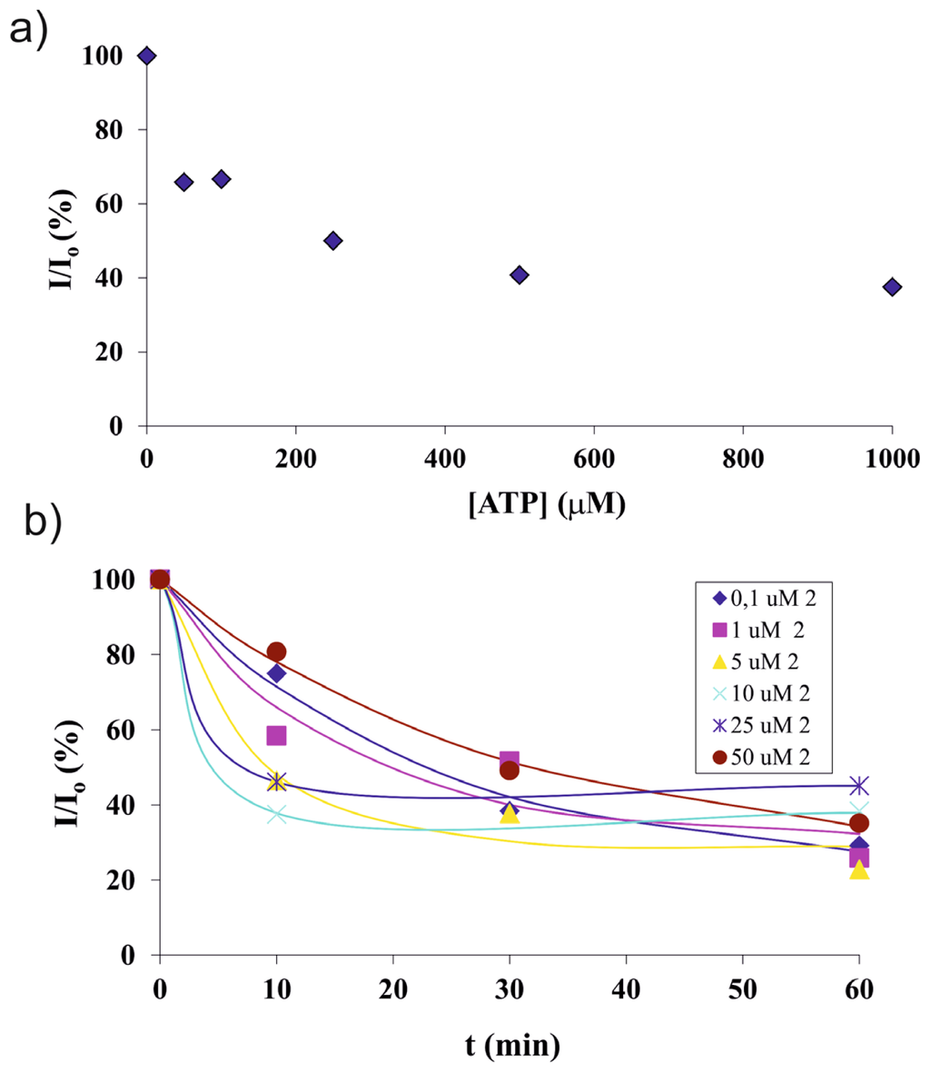 (a) The detection sensitivity profile of ATP at 60 min as a function of different ATP concentrations; (b) Fluorescence intensity vs. time profiles of 1 mM ATP in the presence of different concentrations of 2.