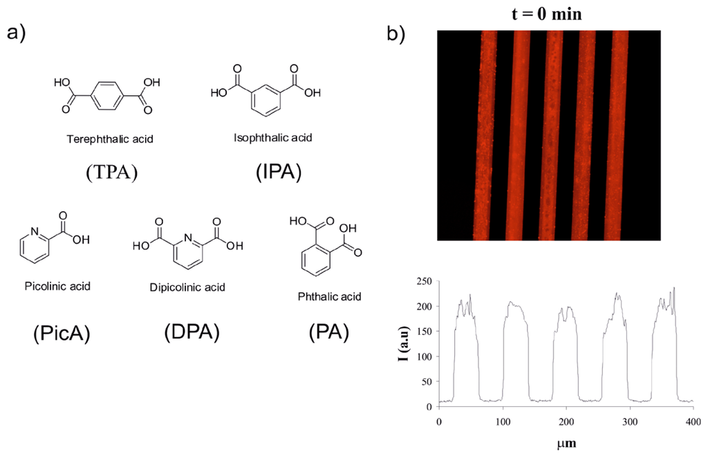 (a) The structure of aromatic carboxylic acids: p-phthalic acid (TPA), picolinic acid (PicA), dipicolinic acid (DPA), o-phthalic acid (PA), and m-phthalic acid (IPA); (b) Fluorescence microscopy images and intensity profiles of the multichannel surface upon carboxylic acid screening at t = 0 min; (c) t = 10 min; (d) and t = 60 min.