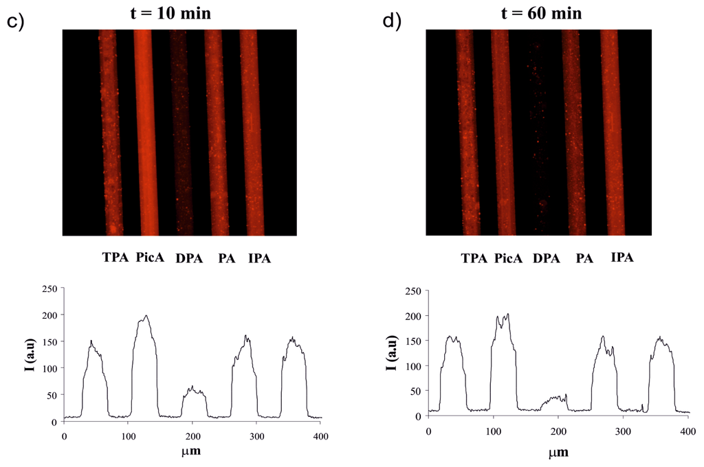 A multichannel chip with five parallel channels was used for generation of the sensing array via the formation of βCD SAMs and subsequent attachment of building blocks of interest on each channel surface (Figure 1a). Parallel synthesis of five sensing SAMs in the multichannel chip was performed by the formation of βCD SAMs on the channel surface as described above, leading to an array of five βCD SAMs confined to a single chip, and providing a functional layer for further surface modification in the multichannel. Two building blocks were used to fabricate the sensor surface in the microchip: an ethylenediamine tetraacetic acid (EDTA)-based ligand (1) for binding Eu3+ and the receptor surface, and a naphthalene-based antenna (2) for coordination to Eu3+ via the diketonate moiety (Scheme 1). Building block 1 has adamantyl groups for immobilization onto the βCD SAMs. To fabricate sensing surfaces on the microchip surface, a stepwise procedure was followed. Briefly, in the first step, 1 mM of 1.Eu3+ was attached on the βCD monolayer after 30 min incubation in the microchip. After cleaning the microchip surface with water for 10 min, 100 μM of 2 was incorporated onto βCD SAMs via coordination of 2 with 1.Eu3+ as seen in Scheme 1. After a second cleaning step of the microchip surface with water for 10 min, the multichannel surface was imaged by fluorescence microscope using filter R (300 nm < λexc< 400 nm, λem = 615 nm). Five luminescent SAM-modified microchannels were visualized simultaneously (Figure 1b) by fluorescence microscopy, which showed energy transfer from the Eu-coordinated napthalene moiety of 2 to the Eu3+ center of 1.Eu3+, and the emission of red light at 615 nm as studied before [22,45]. Thereby, a highly luminescent surface platform was achieved in the multichannel device for the detection of phosphates and aromatic carboxylic acids.