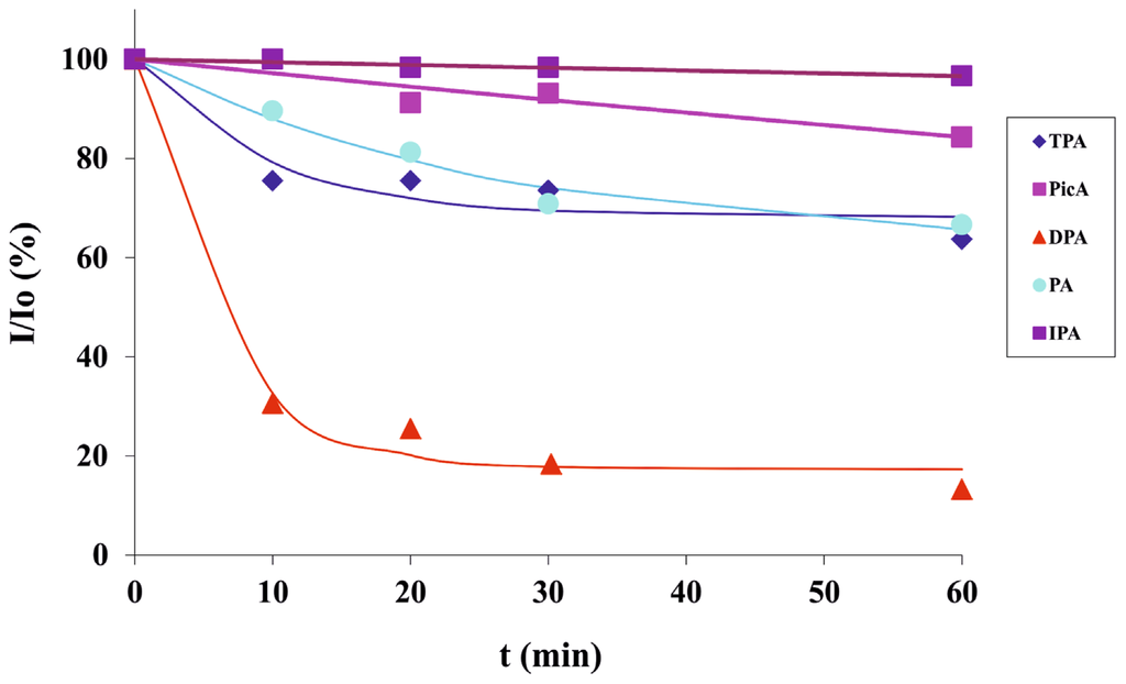 The same supramolecular lanthanide-based microfluidic platform was also used for the detection of the anthrax biomarker DPA, among other potentially competitive aromatic ligands as a demonstration of a surface-based sensing device that offers a general high-throughput detection platform both for phosphates and aromatic carboxylates. In order to investigate aromatic carboxylic acid detection, five different aromatic carboxylic acids (1 mM each), o/m/p-phthalic acids, picolinic acid and DPA, were injected from each inlet continuously and their sensing was evaluated within 1 h. Among those five aromatic ligands (Figure 5a), only DPA was sensed by 2-1.Eu3+ and selectively displaced the antenna, thus quenched around 80% of the red luminescence in 10 min whereas the effect of the other aromatic acids on the displacement of 2 was negligible (up to 25% quenching of red emission with terephthalic acid) (Figure 5b,c and Figure 6). Excellent selectivity was achieved with DPA over other potentially interfering aromatic acids after 1 h (Figure 5d, Figure 6), while other interferants showed weak response on the sensor surface (up to 35% quenching of red emission with picolinic and isophthalic acid). The response half-time of DPA was determined based on the exponential decay curve in Figure 6, and DPA showed a response half-time of around 5 min.