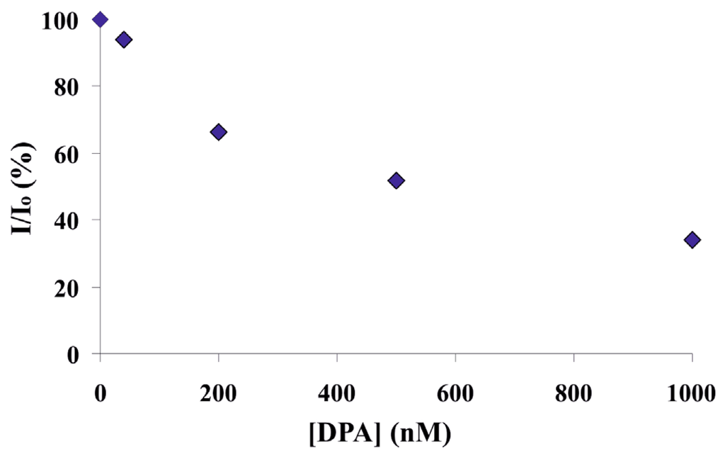 To determine the detection limit of DPA sensing on the microchip platform, DPA detection was performed as a function of concentration. Initially, five different concentrations ranging from 1 mM down to 500 nM DPA were injected continuously from each inlet by a peristaltic pump and their sensing was evaluated within 1 h. Lower concentrations down to 40 nM were also used to determine the detection limit of DPA. The intensity ratio (I/I0) values of the sensor substrates were plotted as a function of the DPA concentration (0–1 μM) at t = 60 min in Figure 7. Lower concentrations of DPA resulted in less quenching of the red emission showing that DPA sensing is concentration dependent. 1 μM DPA quenched red emission as effective as 1 mM DPA (around 70%–80%), and nM concentrations of DPA still showed significant response on the sensor surface (Figure 7). Thus, DPA was sensed by the Eu3+ based complex with <100 nM detection limit. Such a detection sensitivity range is consistent with literature [22].