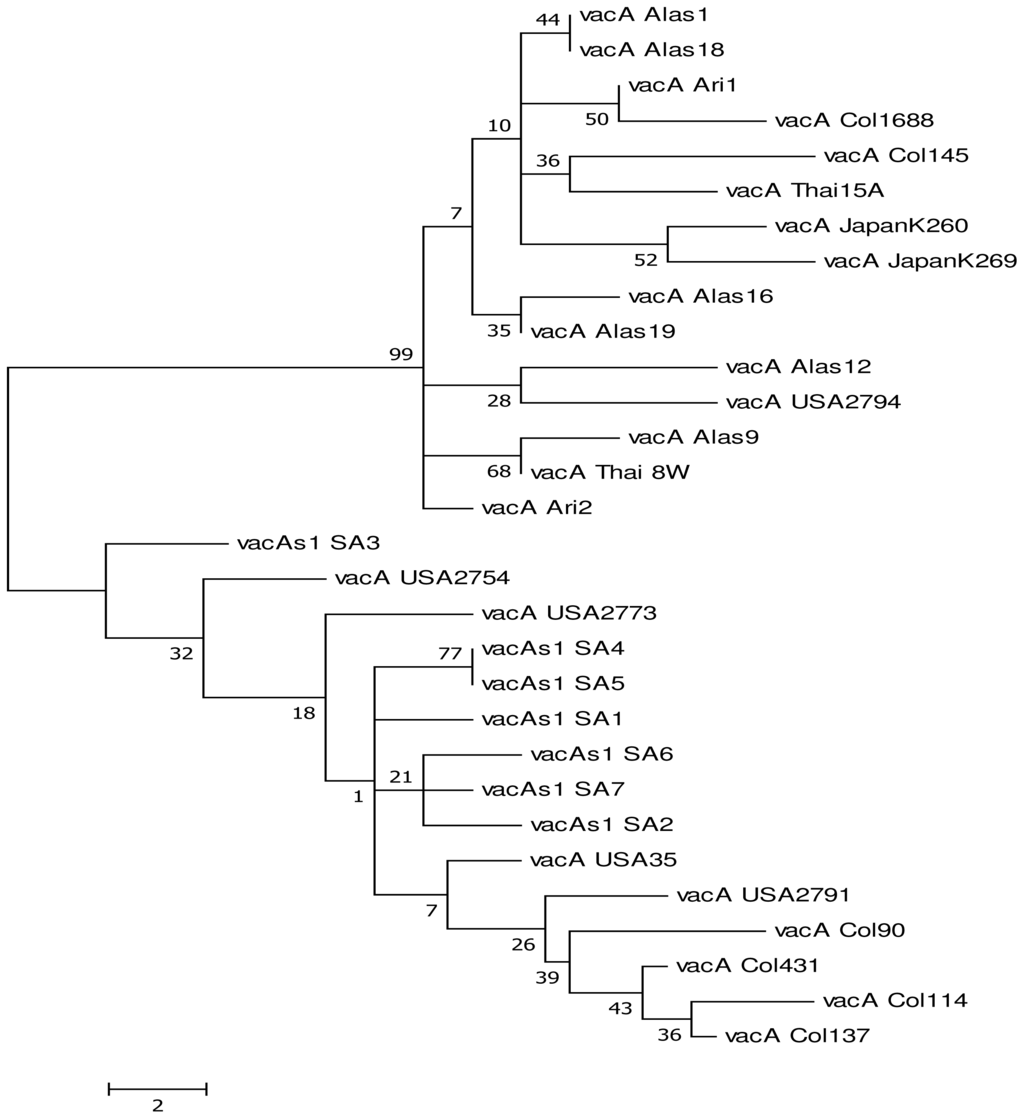 Figure 1. Maximum parsimony analysis of vacAs1 sequences from clinical isolates showing that phylogenetic analysis between strains is not distinct. There is clustering between the strains. Branches with significant bootstrap support are indicated; origins of H. pylori strains are labelled with a code: SA—South Africa, USA—USA, Col—Colombia, Thai—Thailand, Alas—Alaska, Ari—Arizona, Japan-Japan; Bar indicates 2 nucleotide substitution per site. Our vacAs1 sequences were compared with (AB057218.1, AB057223.1, AB057222.1, AB057221.1 AB057219.1, AB057214.1, AB057216.1, AB057217.1, AB057211.1, AB057215.1, AB057190.1, AB057188.1, AB057187.1, AB057185.1, AB057178.1, AB057175.1, AB057184.1, AB057182.1, AB057167.1, AB057164.1, AB057166.1, AB057140.1, AB057139.1).
