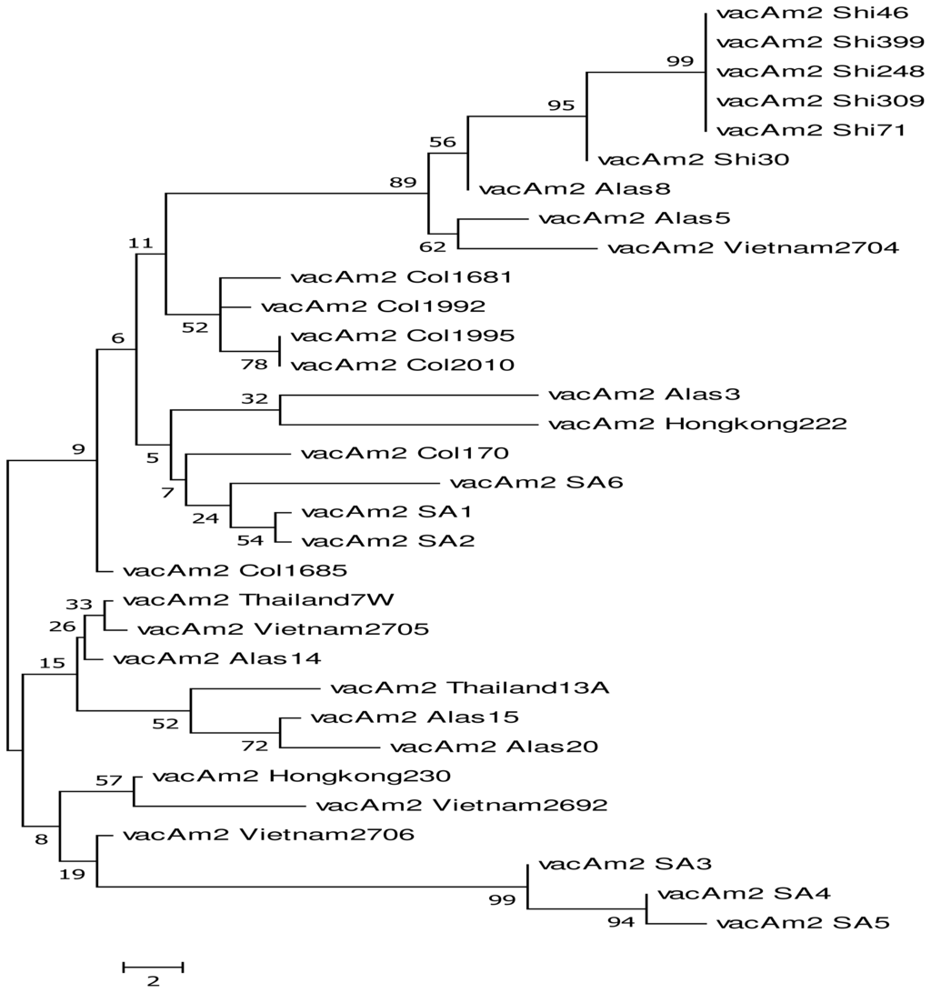 Figure 2. Maximum parsimony analysis of vacAm2 sequences from clinical isolates showing that phylogenetic analysis between strains is not distinct. There is clustering between the strains. Branches with significant bootstrap Support are indicated; origins of H. pylori strains are labelled with a code: SA—South Africa, USA—USA, Col—Colombia, Thailand—Thailand, Vietnam—Vietnam, Alas—Alaska, and Hongkong—Hongkong, Shi—Shi; Bar indicates 2 nucleotide substitutions per site. vacAm2 sequences were compared with the following sequences with accession numbers (AB057325.1 AB057323.1, AB057328.1, AB057327.1, AB057326.1, AB057334.1, AB057301.1, AB057290.1, AB057295.1, AB057302.1, AB057292.1, AB057307.1, AB057277.1, AB057276.1, AB057284.1, AB057286.1, AB057280.1, AB057281.1, AB057279.1, AB057282.1, GU064493.1, GU064499.1, GU064498.1, GU064495.1, GU064496.1, GU064497.1) derived from the gene bank.