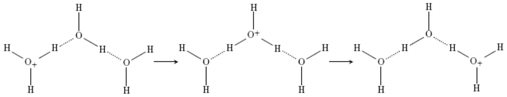 The transport of hydrogen ions (H+) through water is accomplished by the Grotthuss mechanism, in which hydrogen bonds (dashed lines) and covalent bonds (solid lines) between water molecules are broken and re-formed.