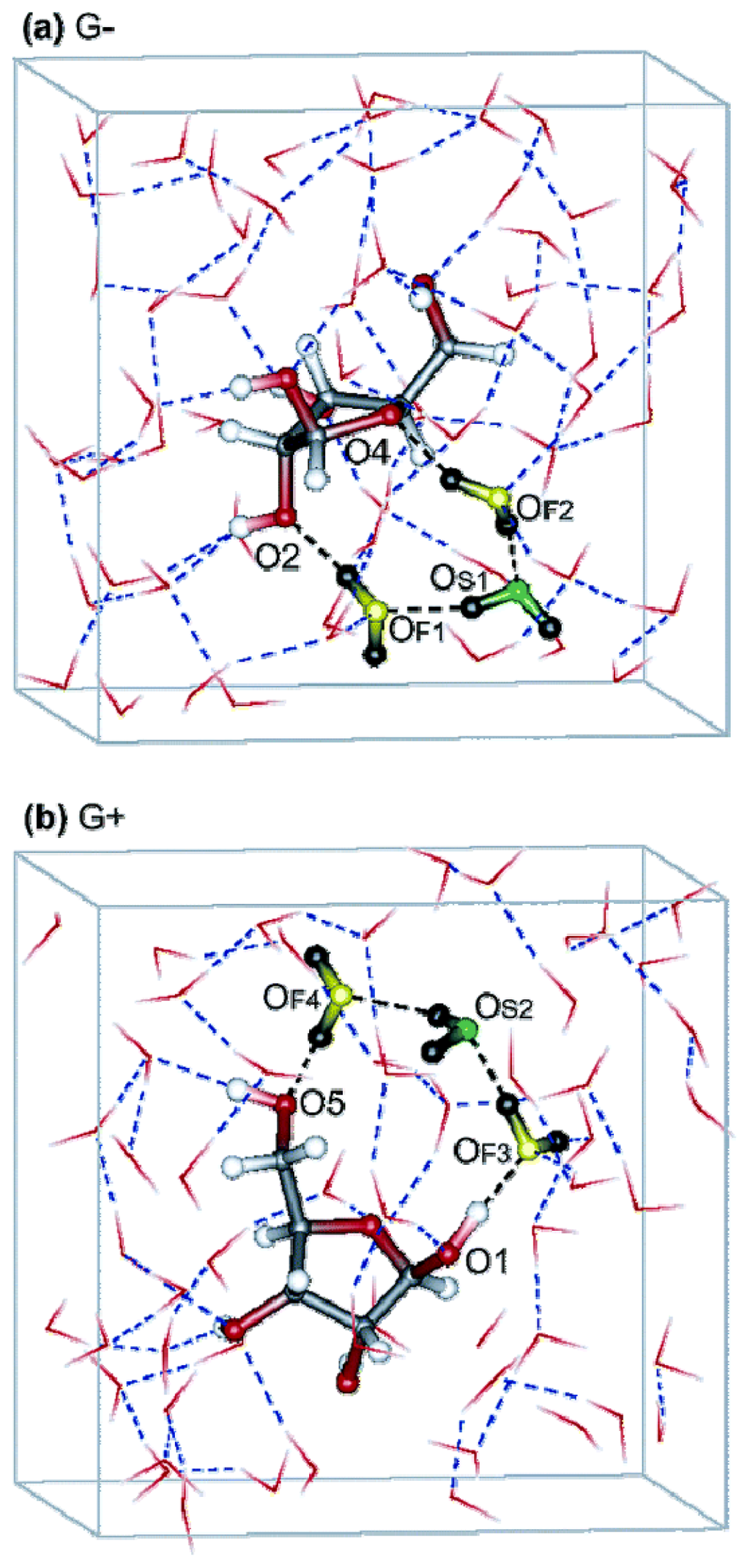 Representative configurations showing circular hydrogen bond networks near the ring oxygen in hydrated G− (a) and G+ (b) rotamers of β-ribofuranose sampled from ab initio MD trajectories by Suzuki and Soto [69]. Hydrogen bonds in the circular hydrogen bond networks are colored separately in black, while others are in blue. The three water molecules that form the circular hydrogen bond networks are represented by ball-andsticks, where oxygens of the first and second hydration shell water molecules are colored separately in yellow and green with hydrogens in black, as well as labeled by the subscripts F and S, respectively. β-ribofuranose and the other water molecules are represented by ball-and-sticks and sticks, respectively (carbon atoms, grey; oxygens, red; hydrogens, white).