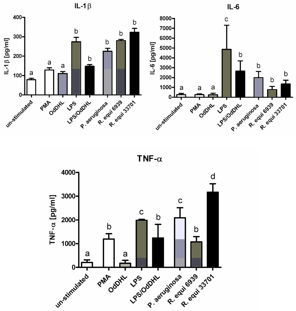 Stimulation of RAW264.7 with lipopolysaccharide (LPS), phorbol-12-myristate-13-acetate (PMA), P. aeruginosa and R. equi respectively induced an increase in the concentration of pro-inflammatory cytokines in cell supernatants (Figure 1). Significant differences depending on the stimulator added could be assessed. Treatment of the cells with LPS resulted in a significant increase in the concentration of IL-1β, IL-6 as well as TNF-α (Figure 1). In contrast, after stimulation of the macrophages with PMA a significant increase could only be seen for TNF-α (Figure 1). Addition of the quorum sensing molecule N3-oxododecanoyl-l-homoserine lactone (OdDHL) to the culture medium did not affect the concentration of pro-inflammatory cytokines in cell supernatants (Figure 1). The combination of LPS and OdDHL abrogated the stimulating effect of LPS on IL-1β, IL-6 and TNF-α synthesis (Figure 1). Culturing of RAW264.7 in presence of the viable pathogens P. aeruginosa and R. equi boosted proinflammatory cytokine synthesis as well (Figure 1). The virulent strain R. equi ATCC 33701 was found to act more effectively in increasing the production of IL-1β, IL-6 and TNF-α by the macrophages than the non-virulent strain R. equi ATCC 6939 (Figure 1).
