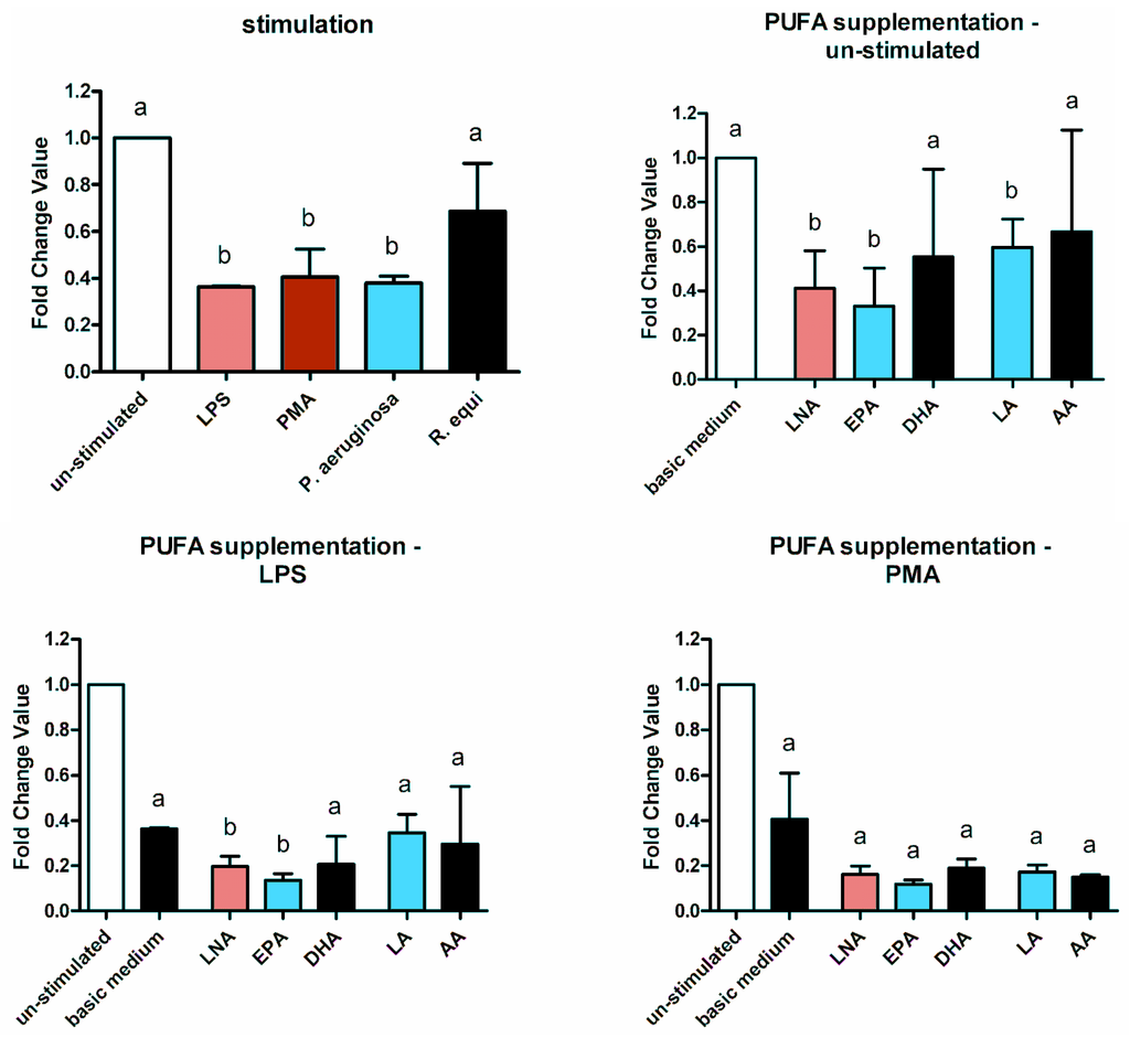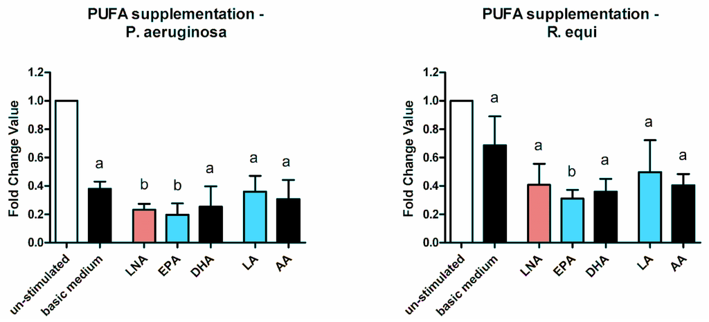 Feeding studies concerning the impact of PUFA supplementation on immune defense mechanisms yielded conflicting findings, so far. This is aggravated by variations in experimental settings leading to a lack in comparability of gained results. Moreover, virtually no data regarding the relevance of PUFA in case of macrophage infection with R. equi or P. aeruginosa exist. Hence, in this in vitro-study under defined conditions, we reveal the implication of stimulation and PUFA supplementation on key proteins of innate immune response.