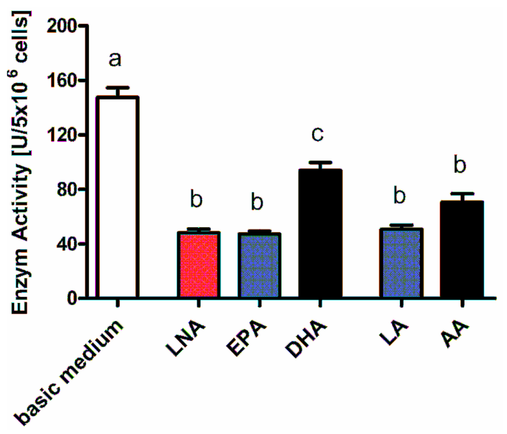 Total enzyme activity of lysozyme of RAW264.7 macrophages cultured in basic medium as well as in medium supplemented with 15 μmol/L alpha-linolenic acid (LNA), eicosapentaenoic acid (EPA), docosahexaenoic acid (DHA), linoleic acid (LA) or arachidonic acid (AA). Data are mean ± SD (n = 6). Bars denoted by different letters are significantly different.