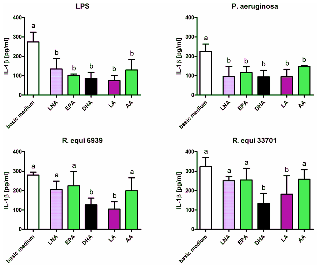 Concentration of IL-1β in supernatants of RAW264.7 macrophages cultured in basic medium as well as in medium supplemented with 15 μmol/L alpha-linolenic acid (LNA), eicosapentaenoic acid (EPA), docosahexaenoic acid (DHA), linoleic acid (LA) or arachidonic acid (AA) after 24 h of stimulation with LPS, P. aeruginosa ATCC 10145, R. equi ATCC 6939 and R. equi ATCC 33701 respectively. Data are mean ± SD (n = 6). Bars denoted by different letters are significantly different.