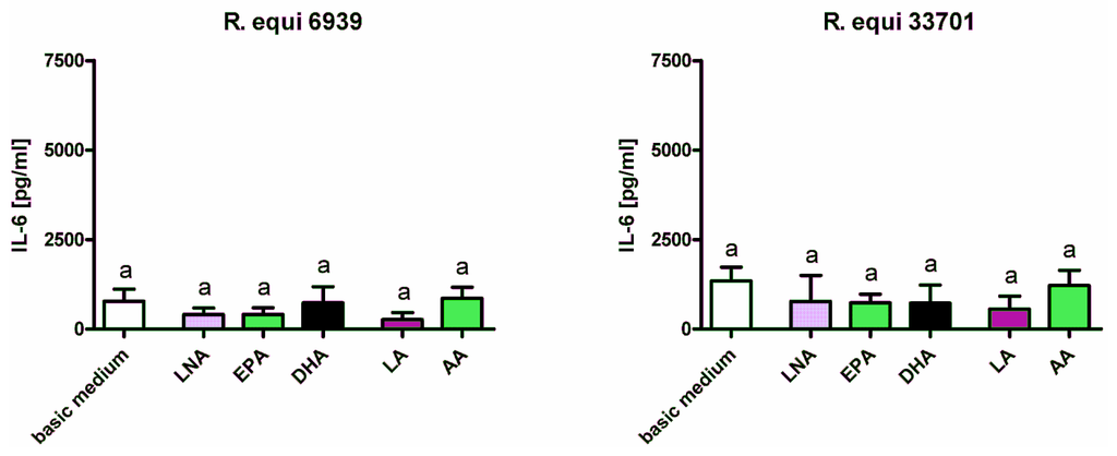 Concentration of IL-6 in supernatants of RAW264.7 macrophages cultured in basic medium as well as in medium supplemented with 15 μmol/L alpha-linolenic acid (LNA), eicosapentaenoic acid (EPA), docosahexaenoic acid (DHA), linoleic acid (LA) or arachidonic acid (AA) after 24 h of stimulation with LPS, P. aeruginosa ATCC 10145, R. equi ATCC 6939 and R. equi ATCC 33701 respectively. Data are mean ± SD (n = 6). Bars denoted by different letters are significantly different.