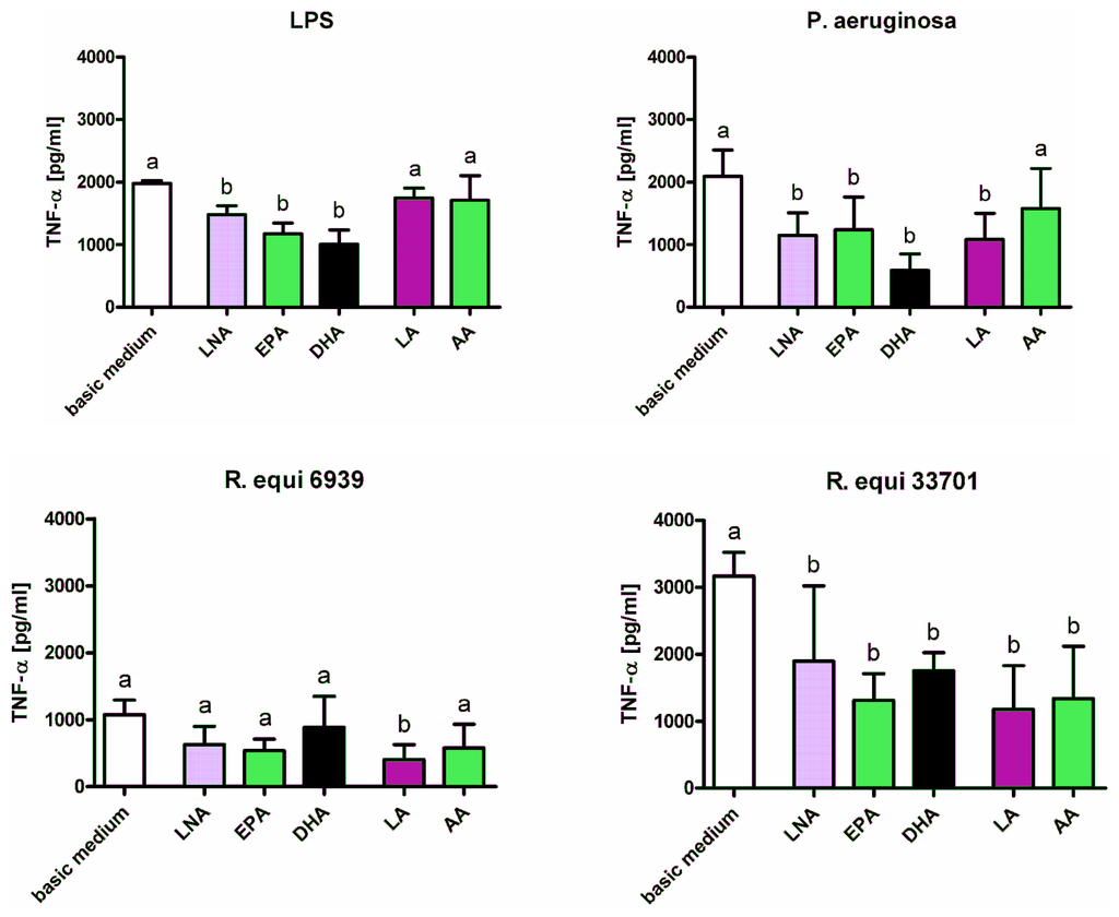 Concentration of TNF-α in supernatants of RAW264.7 macrophages cultured in basic medium as well as in medium supplemented with 15 μmol/L alpha-linolenic acid (LNA), eicosapentaenoic acid (EPA), docosahexaenoic acid (DHA), linoleic acid (LA) or arachidonic acid (AA) after 24 h of stimulation with LPS, P. aeruginosa ATCC 10145, R. equi ATCC 6939 and R. equi ATCC 33701 respectively. Data are mean ± SD (n = 6). Bars denoted by different letters are significantly different.