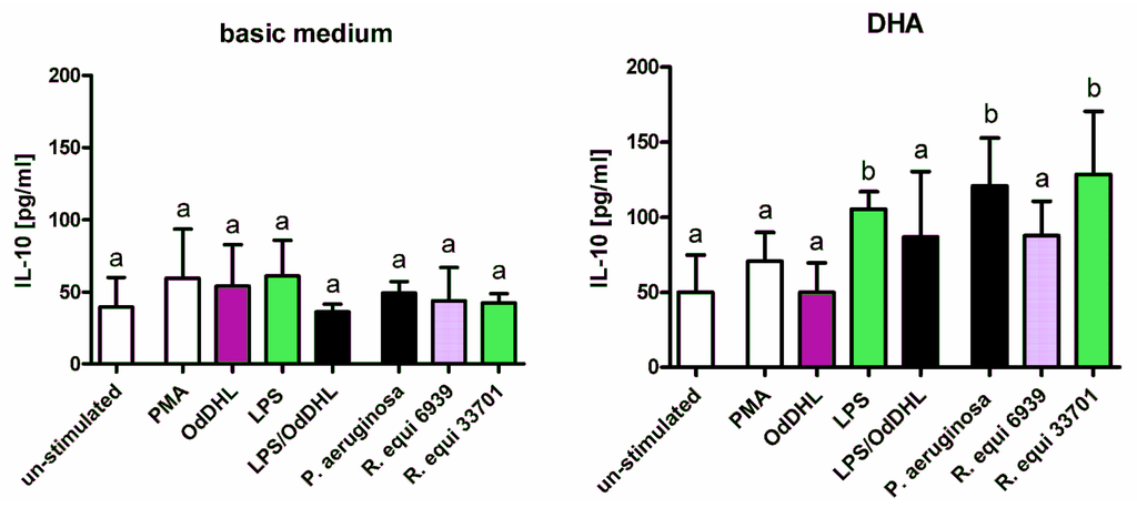 Synthesis of the anti-inflammatory cytokine IL-10 was not significantly affected by stimulation of RAW264.7 with LPS, PMA, P. aeruginosa and R. equi respectively (Figure 5). Likewise, supplementation of the macrophages with the n-3 PUFA LNA and EPA or the n-6 PUFA LA and AA did not result in any changes in IL-10 concentration in cell supernatants both for un-stimulated as well as for stimulated cells (data not shown). Enrichment of the culture medium with DHA, however, brought about a significant increase in IL-10 production and secretion of RAW264.7 stimulated with LPS, P. aeruginosa and R. equi respectively (Figure 5). Treatment of the cells with LPS in combination with OdDHL abolished this effect (Figure 5).