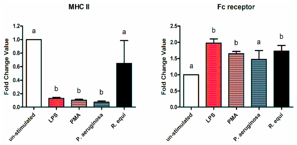 Expression of the MHCII and the Fc receptor mRNA by RAW264.7 macrophages cultured in basic medium after 24 h of stimulation with LPS, PMA, P. aeruginosa ATCC 10145 and R. equi ATCC 33701 respectively. Data are mean ± SD (n = 6). Bars denoted by different letters are significantly different.