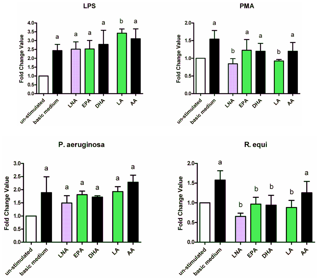 Expression of the lysozyme mRNA by RAW264.7 macrophages cultured in basic medium as well as in medium supplemented with 15 μmol/L alpha-linolenic acid (LNA), eicosapentaenoic acid (EPA), docosahexaenoic acid (DHA), linoleic acid (LA) or arachidonic acid (AA) after 24 h of stimulation with LPS, PMA, P. aeruginosa ATCC 10145 and R. equi ATCC 33701 respectively. Data are mean ± SD (n = 6). Bars denoted by different letters are significantly different.