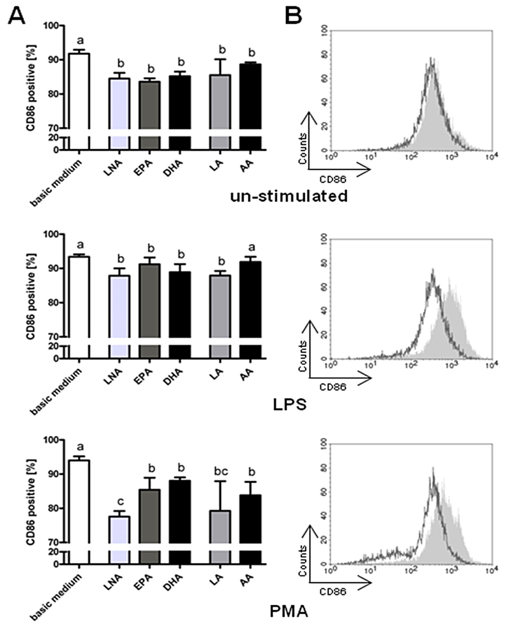 Expression of the surface molecule CD86 by RAW264.7 macrophages cultured in basic medium as well as in medium supplemented with 15 μmol/L alpha-linolenic acid (LNA), eicosapentaenoic acid (EPA), docosahexaenoic acid (DHA), linoleic acid (LA) or arachidonic acid (AA) after 24 h of stimulation with LPS, PMA, P. aeruginosa ATCC 10145 and R. equi ATCC 33701 respectively. (A) Percentage of CD86 positive cells. Data are mean ± SD (n = 6). Bars denoted by different letters are significantly different; (B) Histograms of surface expression levels of CD86. The grey-shaded histograms correspond to RAW264.7 cultured in basic medium, and empty histograms (dark grey line) correspond to RAW264.7 cultured in LNA supplemented medium. Histograms are representative of one of six experiments.