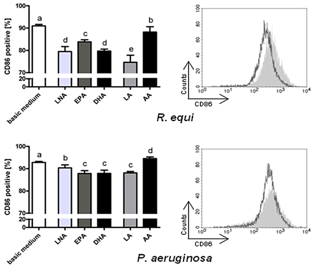 Expression of the CD86 mRNA by RAW264.7 macrophages cultured in basic medium as well as in medium supplemented with 15 μmol/L alpha-linolenic acid (LNA), eicosapentaenoic acid (EPA), docosahexaenoic acid (DHA), linoleic acid (LA) or arachidonic acid (AA) after 24 h of stimulation with LPS, PMA, P. aeruginosa ATCC 10145 and R. equi ATCC 33701 respectively. Data are mean ± SD (n = 6). Bars denoted by different letters are significantly different.