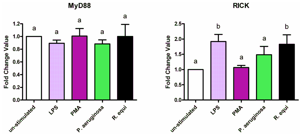 Expression of the MyD88 and the RICK mRNA by RAW264.7 macrophages cultured in basic medium after 24 h of stimulation with LPS, PMA, P. aeruginosa ATCC 10145 and R. equi ATCC 33701 respectively. Data are mean ± SD (n = 6). Bars denoted by different letters are significantly different.
