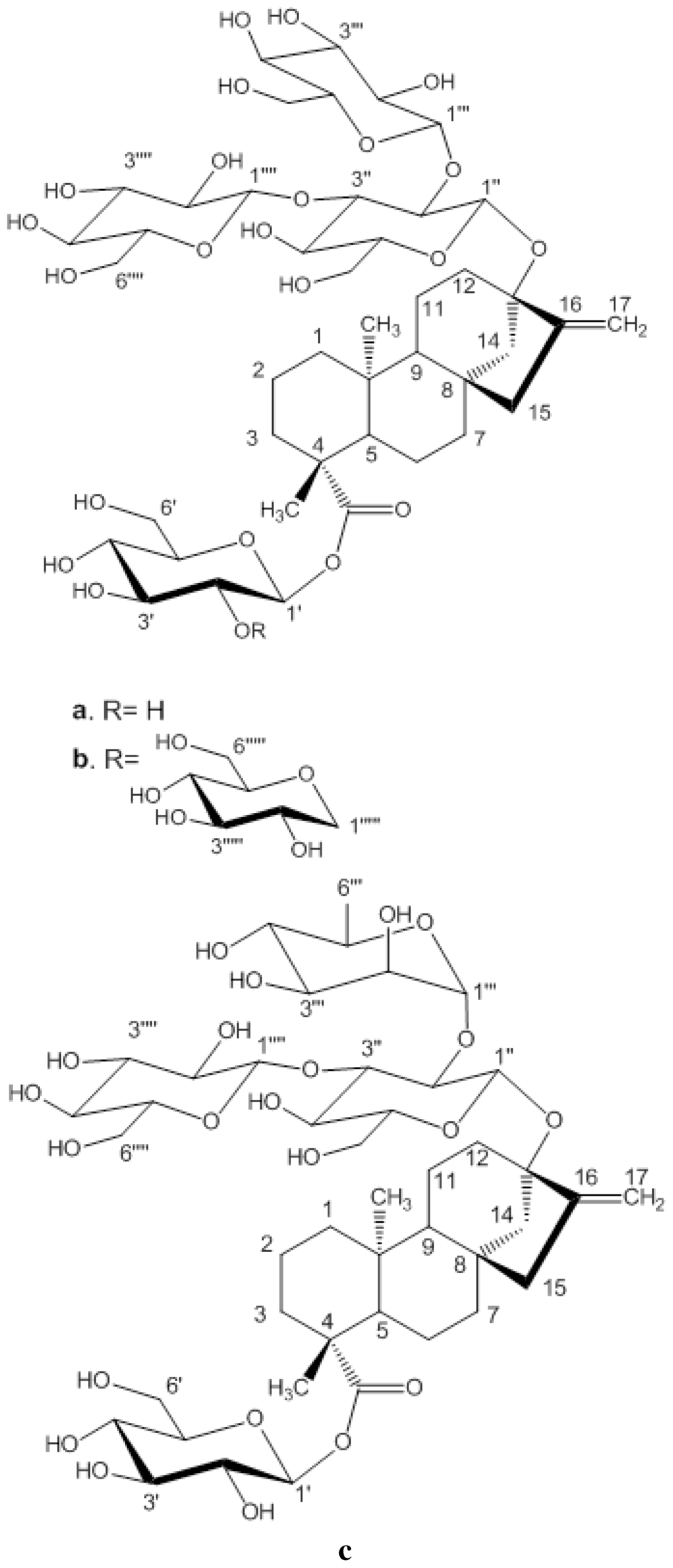 Structures and carbon numberings of the steviol glycosides (a) rebaudioside A (b) rebaudioside D (c) rebaudioside C.