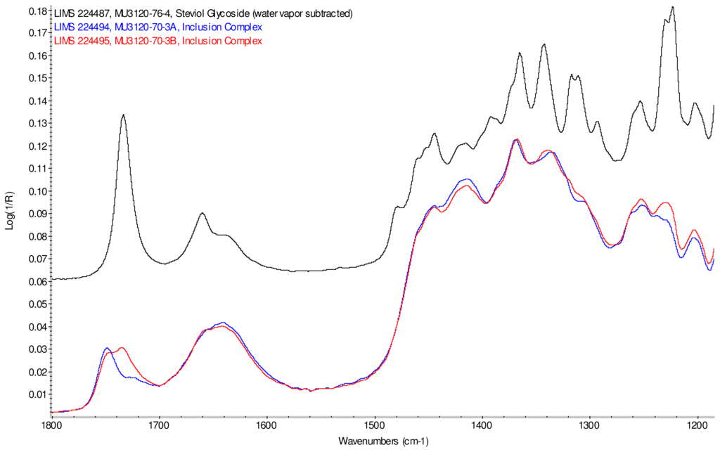 The infrared spectra of cyclodextrin and the steviol glycosides were corrected for presence of water vapor and intensity was normalized. Linear combinations of IR spectra were generated using cyclodextrin and each steviol glycoside; each component spectrum was arbitrarily scaled to produce an addition spectrum that closely resembles the corresponding physical mixture spectrum. These addition spectra were overlaid with the infrared spectra of the corresponding supplied physical mixtures and both were found to match well.