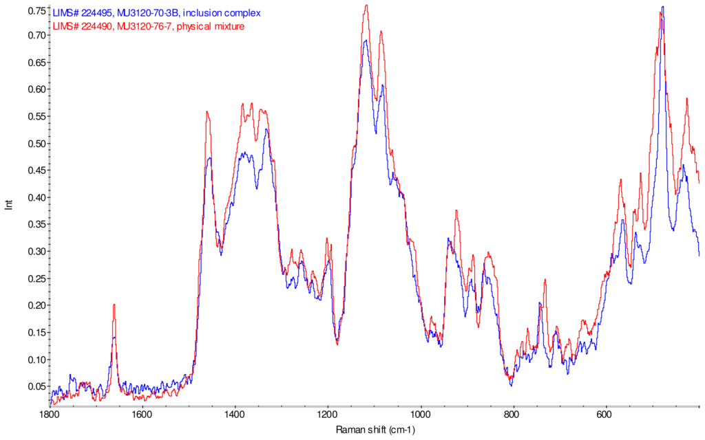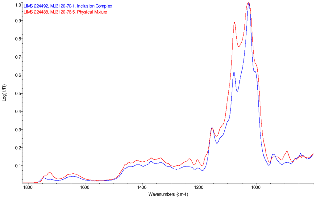 Intensity normalized infrared spectra of each inclusion complex with its corresponding physical mixture are overlaid as displayed in Figure 6–Figure 9. Infrared spectra of the inclusion complexes and corresponding physical mixtures display clear variations in band positions and intensities, indicating differences in solid state compositions of each sample set.
