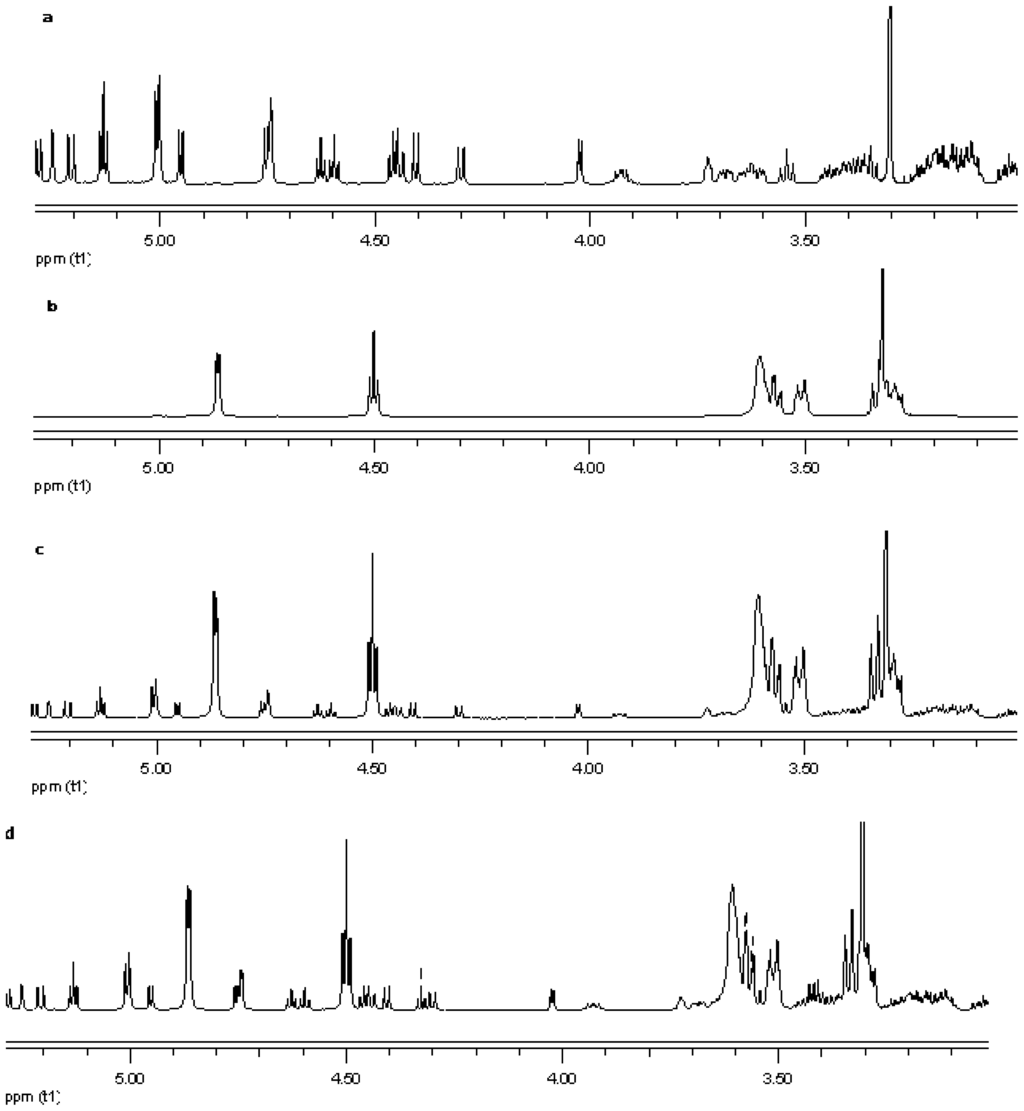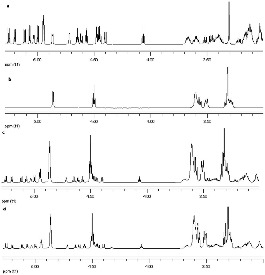 Proton NMR data from top (a) reb C; (b) γ-CD; (c) physical mixture of γ-CD and reb C; and (d) inclusion complex γ-CD/reb C.