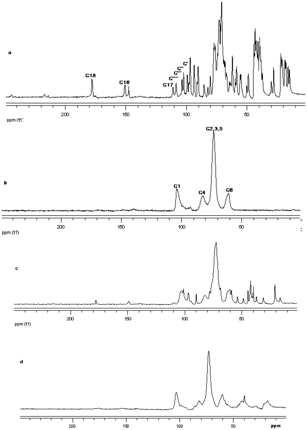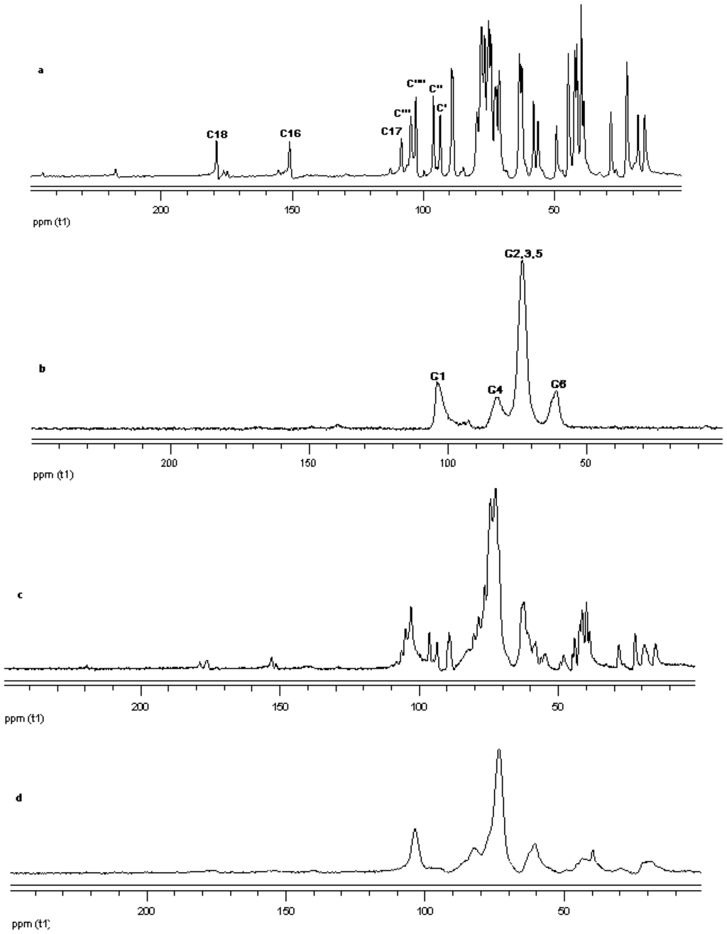 13C CP/MAS solid state NMR data from top (a) reb D; (b) γ-CD; (c) physical mixture of γ-CD and reb D; and (d) inclusion complex γ-CD/reb D.