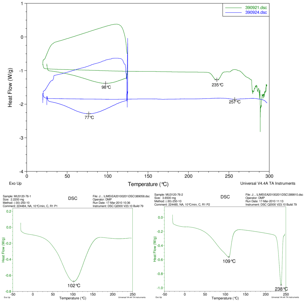 At top, overlay of DSC thermograms of physical mixture of γ-CD and reb A, top trace, green and inclusion complex γ-CD/reb A bottom trace, blue. At bottom, differential scanning calorimetry (DSC) thermograms of cyclodextrin, left and reb A, right.