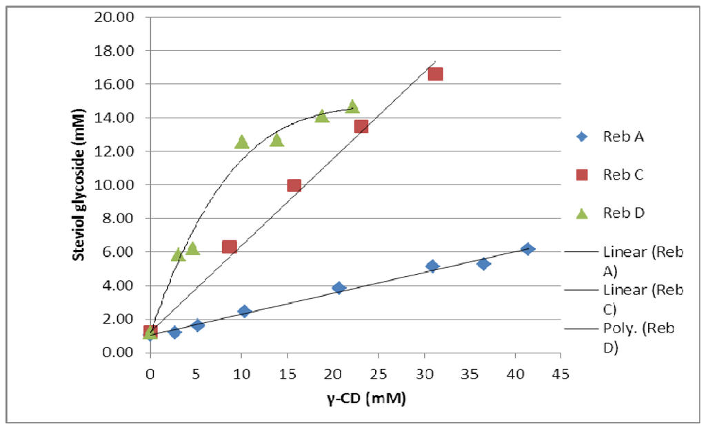 Phase solubility diagrams for the three steviol glycosides, reb A, reb C and reb D with γ-CD in aqueous solution at 25 °C.