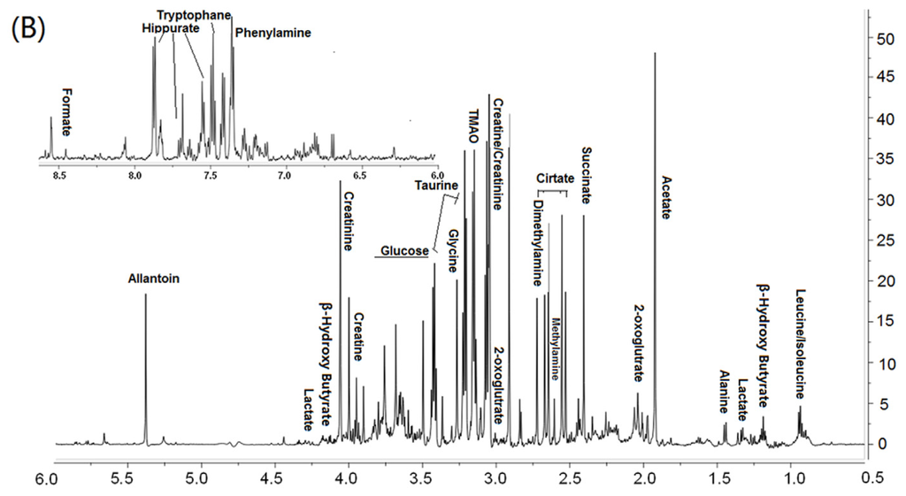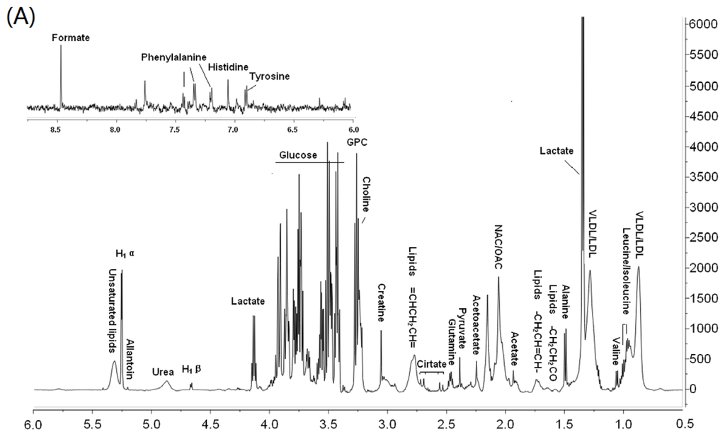 Urine or plasma samples were defrosted and centrifuged at 10,000 rpm for 10 min before 1HNMR detection. 400 μL supernatant was transferred into NMR tubes (diameter, 5 mm), with addition of 200 μL PBS buffer solution, 100 μL D2O and 50 μL DSS (2, 2-dimethylsilapentane-4-sulfonic acid, 1 mM final concentration, internal standard). 1HNMR measurement was made on a Bruker AVANCE II 600 spectrometer at 600. 13 MHz 1H frequency (Bruker Spectrospin AG, SWISS). 1HNMR spectra of the urine and plasma samples were acquired using a solvent pre-saturation pulse sequence to suppress the residual water resonance. Free induction decays (FIDs) were collected at 64 K data points, at 300 K, with a spectral width of 7200 Hz and an acquisition time of 2.04 s, giving a total pulse recycle delay of 3.04 s. The data were zerofilled by a factor of 2, and FIDs were multiplied by an exponential weighting function equivalent to a line broadening of 0.3 Hz prior to Fourier transformation.