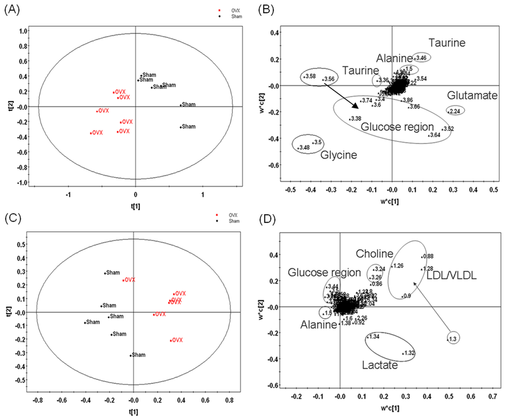 PLS-DA scores plot (A) and corresponding loadings plot (C) are based on the 1H NMR spectra of the plasma samples from Sham (■) and OVX(◆); Scores plot (B) and corresponding loadings plot (D) are based on the 1HNMR spectra of the urine samples from Sham(■) and OVX(◆).
