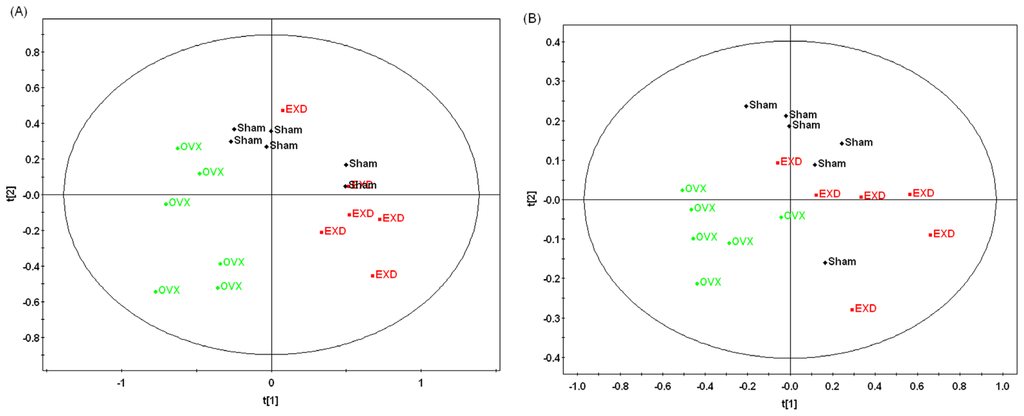 Scores plot from PLS-DA of 1HNMR data of urine (A) and plasma (B) samples obtained from control rats, OVX rats and EXD treatment rats.
