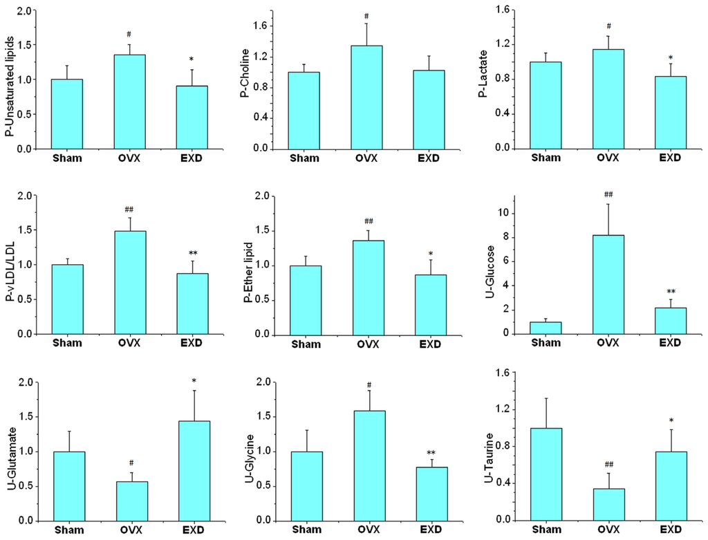 The relative levels of nine significantly altered metabolites in the rats of sham, OVX and EXD treatment groups. The percentage has been calculated with the formula: Contents in groups /content in control group × 100%. P—plasma, U—urine. ## P < 0.01, # P < 0.05 compared with sham group; ** P < 0.01, * P < 0.05 compared with OVX group.
