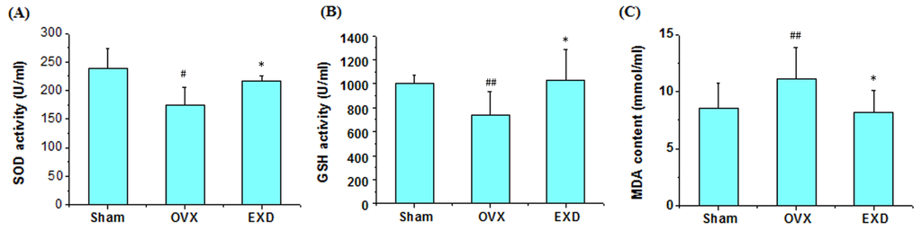 The activity of SOD (A), GSH (B) and the content of MDA (C) in serum of rats of sham, OVX and EXD treatment groups. ## P <0.01, # P < 0.05 compared with sham group; ** P < 0.01, * P < 0.05 compared with OVX group.