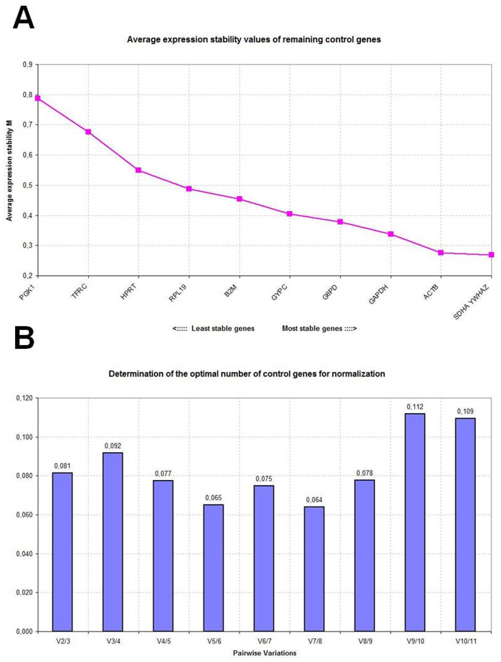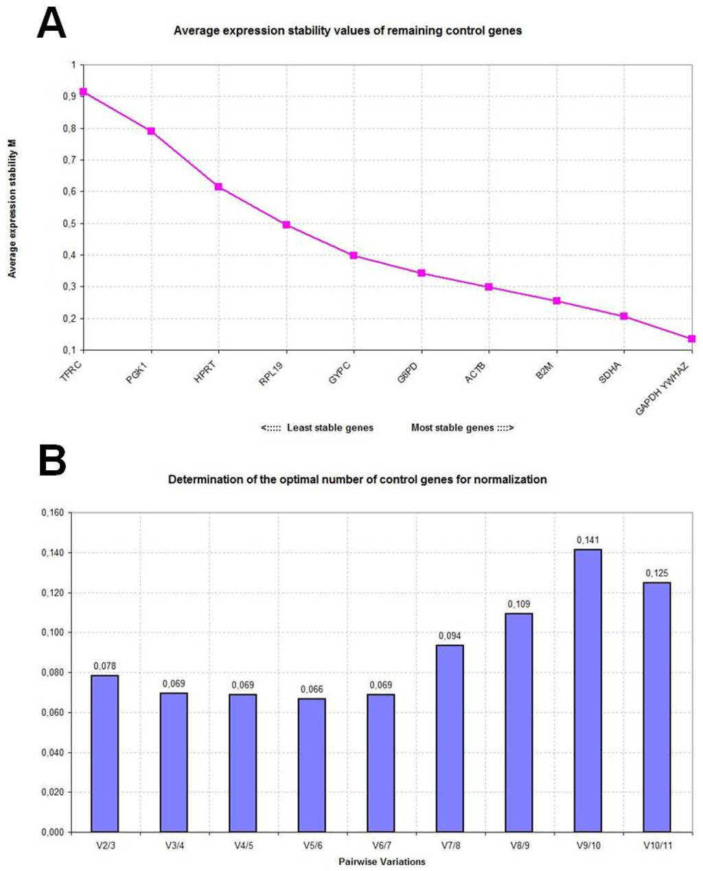Gene expression stability analyzed by the geNorm software in control sheep. (A) Average expression stability measure (M) of control genes during stepwise exclusion of genes with relatively higher variable expression among the samples; (B) Determination of the optimal number of control genes for normalization calculated on the basis of the pairwise variation (V) analysis; V values under 0.15 threshold indicate no need to include further reference genes for calculation of a reliable normalization factor.