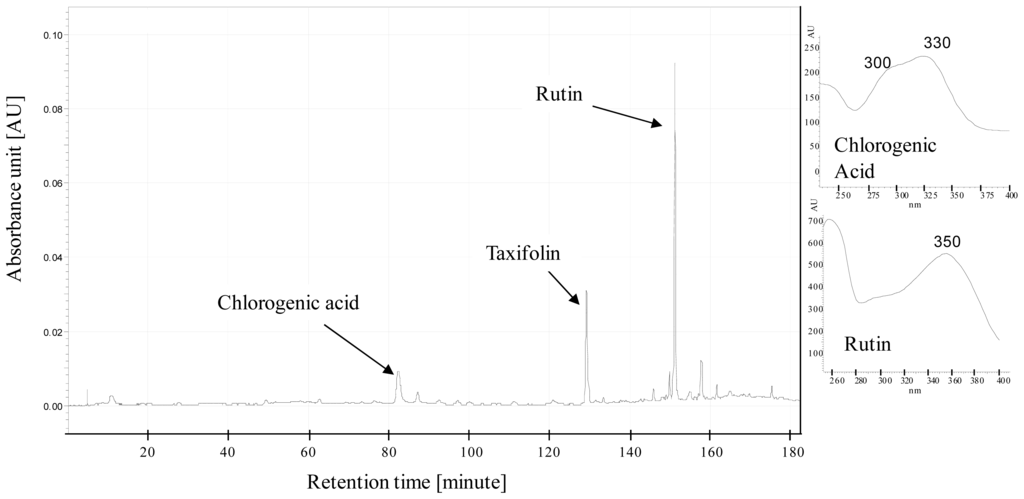 The percentages of total carbon and nitrogen were obtained from 5 mg DM using gas chromatography with a carbon/nitrogen auto-analyzer (Flash EA 1112, Thermo Finnigan, USA). Polyphenols were assayed by HPLC on 50 mg DM, according to the method described in [28]. The samples were analyzed using a Beckman System Gold instrument consisting of a 508 autosampler and a dual wavelength detector (module 166), set at 330 nm for quantifications. Chromatographic separations were performed on a Lichrospher RP-18 end-capped column (4 × 250 mm, 5 μm, Merck, Darmstadt, Germany) fitted with a Lichrospher RP-18 guard column (5 μm, Merck). The mobile phase was a binary solvent system consisting of (A) water adjusted to pH 2.6 with orthophosphoric acid and (B) methanol. The gradient (from 3% to 60% of B in 180 min) was eluted at a flow rate of 0.5 mL min−1 at room temperature. Compounds were identified by their absorption spectra (Figure 5). All compounds were correctly separated, and quantification was based on peak surface area, referred to as a standard curve. Phenolic contents were expressed as mg per g Dry Weight (DW). Taxifolin (50 μL of a solution at 2 mg.mL−1 methanol, Extrasynthèse, Lyon, France) was added as an internal standard. Rutin and chlorogenic acid standards were purchased from Sigma (Sigma, Saint Quentin-Fallavier, France).