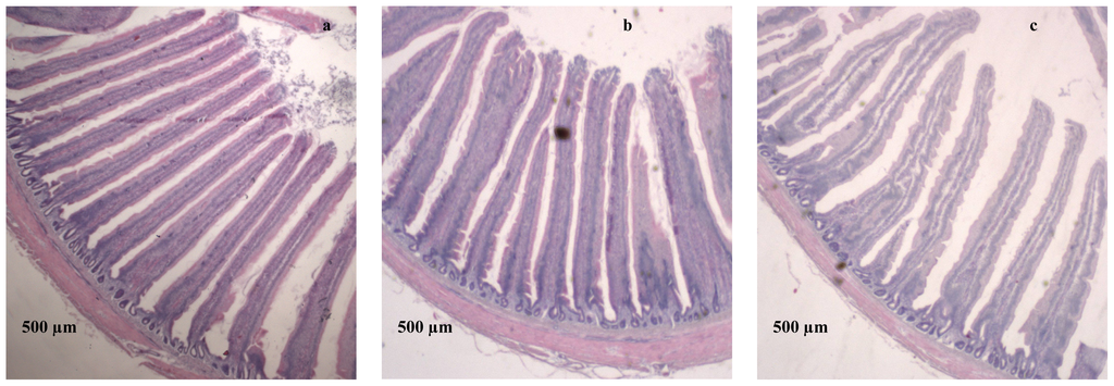 Prelusky et al. [4] reported some changes in pigs fed a diet containing low levels of DON, including alterations in stomach and serum proteins, and suggesting specific effects of Fusarium toxins and particularly DON. The injury of the gastrointestinal tract, involving thickening of the mucosa of the stomach and a higher degree of folding, is one important characteristic of DON toxicity [15]. In addition, Awad et al. [12] found that feeding of broilers with DON artificially contaminated diets at 10 mg/kg altered the small intestinal morphology in the duodenum and jejunum.