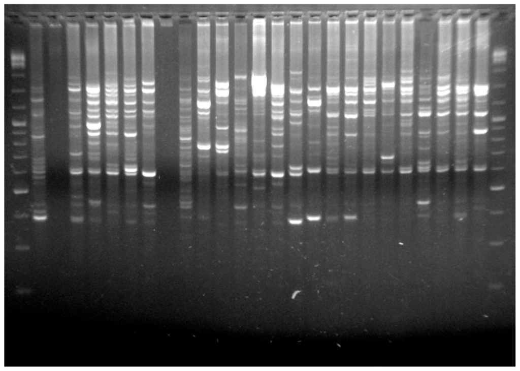 Agarose gel electrophoresis of PCR amplification of RAPDs in R. decussatus.