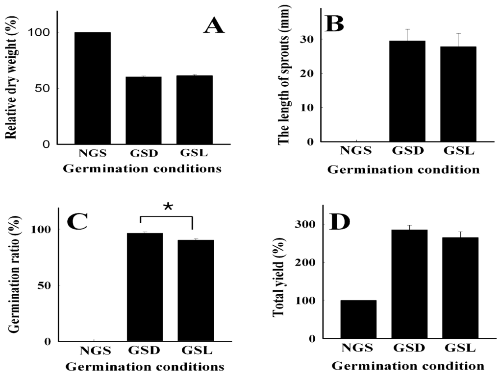 2.3. Comparison of Free Amino Acid Contents in KSS Fermented with Soybeans Germinated under Dark and Light Conditions