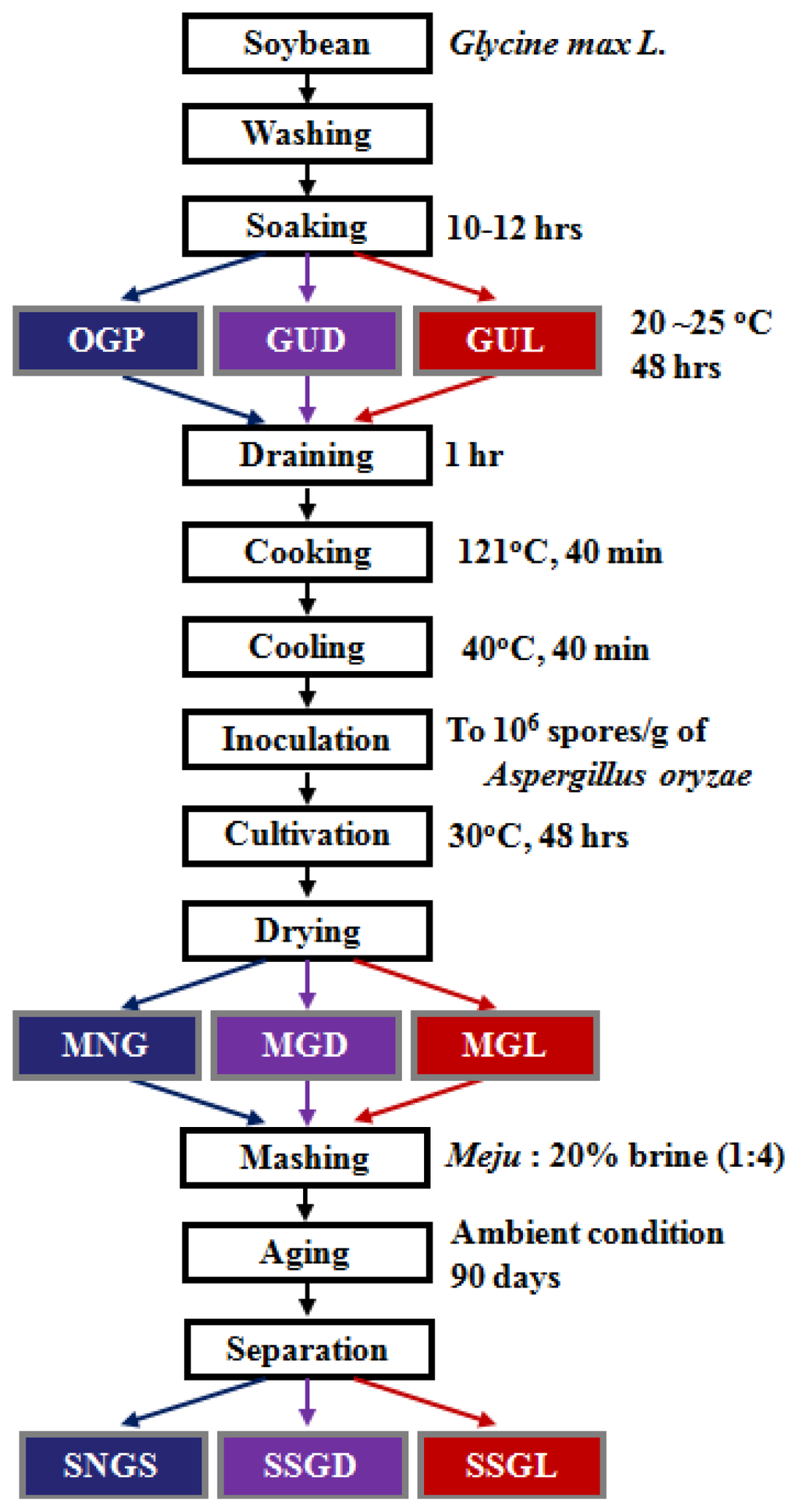 - Choi, U.K.; Jeong, Y.S.; Kim, M.H.; Lee, N.H.; Hwang, Y.H. Quality characteristics of meju according to germination time of raw soybean (Glycine max: Hwanggeumkong). Food Sci. Biotechnol 2007, 16, 386–391. [Google Scholar]