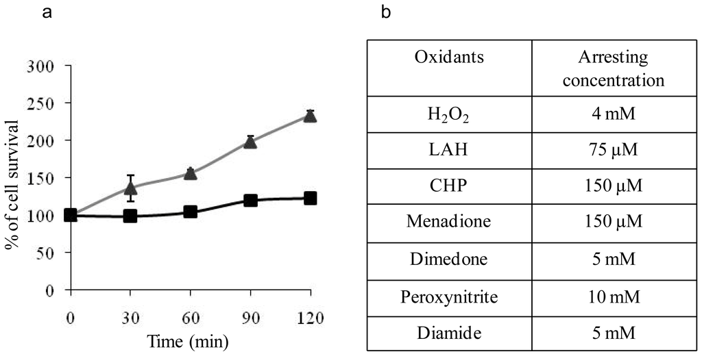 Arresting concentrations of oxidants for S. cerevisiae BY4743. (a) A representative example of yeast growth arrest under LAH-induced oxidative stress. The growth of BY4743 yeast cells treated with 75 μM LAH (■) and without the oxidant (▴) were measured by the percentage of cell survival at each of the time points relative to the starting total cell number at the zero time point. The data represent the means of six replicates for each time point with standard deviation shown; (b) Arresting concentrations for all seven oxidants determined in the same way as LAH were shown.