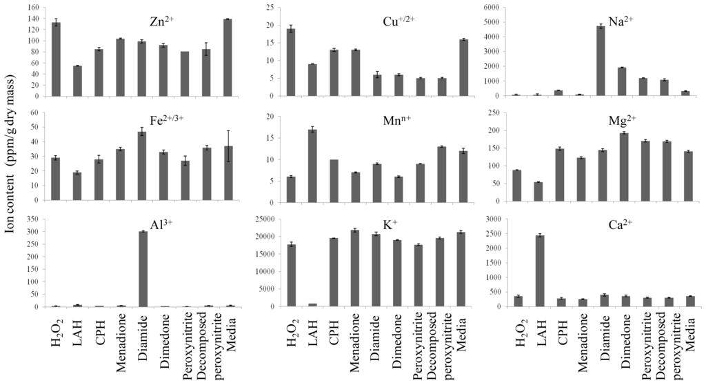 The advent of ICP spectroscopy has made ionomic measurement high throughput and cost-effective compared with transcriptomics and proteomics. The ionomic composition of common elements (Zn2+, Fe2+/3+, Cu+/2+, Mnn+, Cd2+, K+, Na+, Mg2+ and Ca2+) in yeast has been investigated under normal physiological conditions using deletion mutants [8,9]. However, Al3+ has not been studied in detail so far, in spite of its abundance and potential health hazard. In this study, we investigated ionomic profiles by the means of ICP-OES for Zn2+, Cu+/2+, Na+, Fe2+/3+, Mnn+, Mg2+, Al3+, K+ and Ca2+ in yeast cells treated with seven oxidants, including three peroxides [hydrogen peroxide, cumen hydroperoxide (CHP), linoleic acid hydroperoxide (LAH)], and the superoxide-generating agent menadione, the thiol-oxidising diamide [diazine-dicarboxylic acid-bis(dimethylamide)], thiol sulfenic group modifying agent—dimedone (5,5-dimethyl-1,3-cyclohexanedione), and a reactive nitrogen species—peroxynitrite. Subsequent analysis identified several elements which were elevated or reduced under specific oxidative conditions.